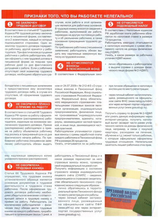 Призываем вас к исполнению действующего законодательства Российской Федерации в части исполнения норм и требований трудового права. За нарушение или неисполнение действующих норм трудового законодательства предусмотрена административная ответственность. Процесс по легализации трудовых отношений способствует улучшению труда и выполнению социальных гарантий для работников. Работа в данном направлении будет продолжена.