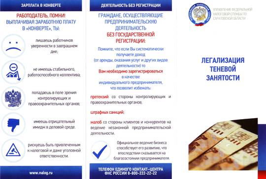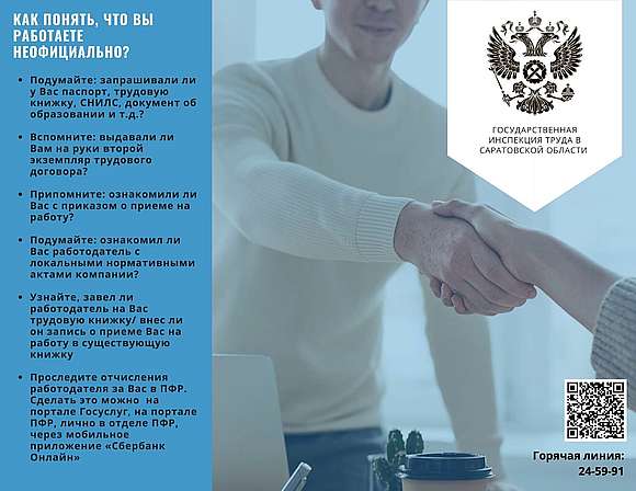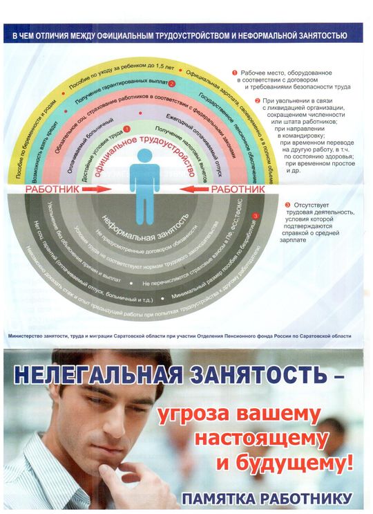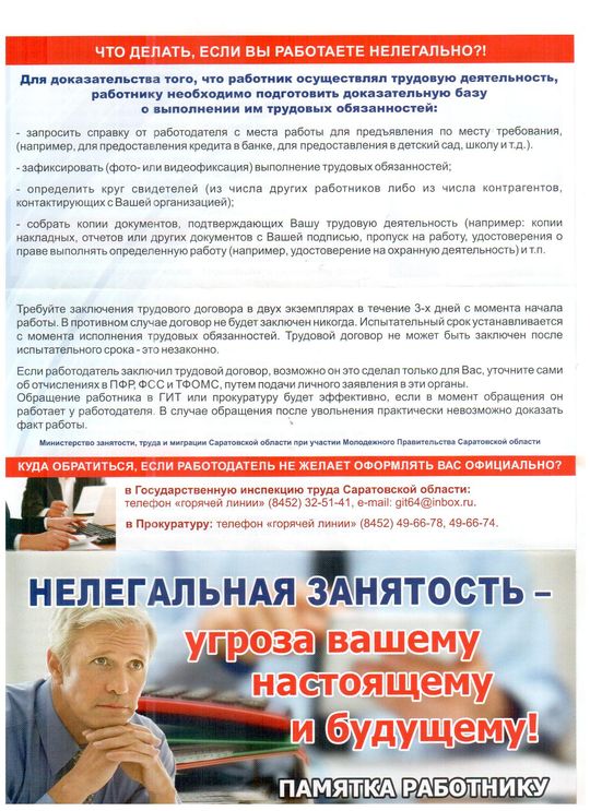 Чтобы не подвергать себя опасности и не способствовать развитию неформальной занятости, необходимо пресекать предложения работодателя не заключать трудовой договор. Напоминаем, что для этого вы можете обратиться в Государственную инспекцию труда в Саратовской области.
