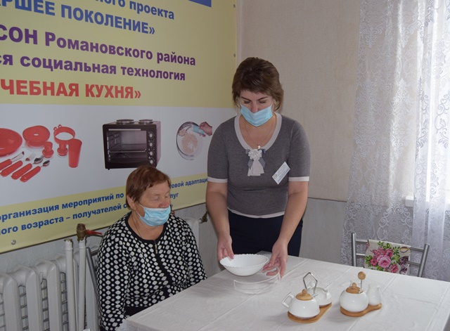 Специалист по социальной работе ГАУ СО КЦСОН Романовского района провела очередное занятие социальной технологии- модуль «Учебная кухня». Данная технология оборудована в рамках региональной программы «Старшее поколение» национального проекта «Демография».