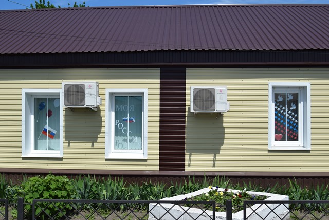 Окна учреждения украшены надписями, аппликациями, посвящёнными России - своей Родине.