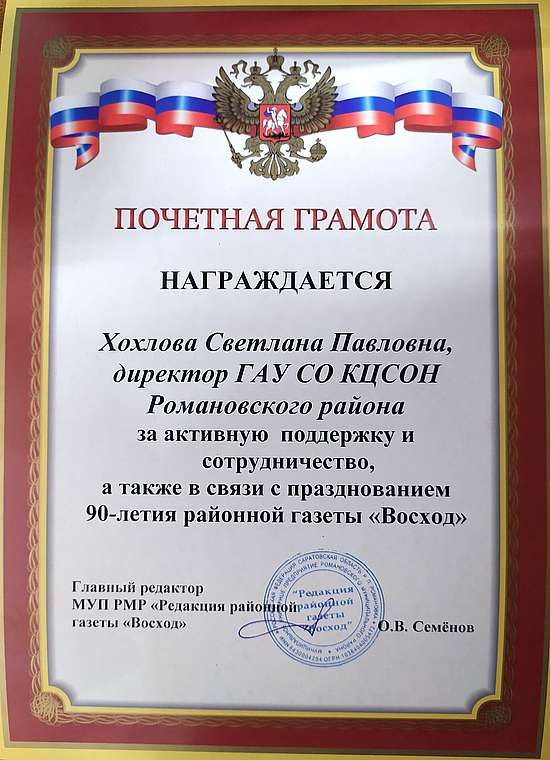 В связи с юбилеем главный редактор газеты «Восход» накануне вручил директору ГАУ СО КЦСОН Романовского района Светлане Хохловой почетную грамоту за активную поддержку и многолетнее сотрудничество с редакцией.