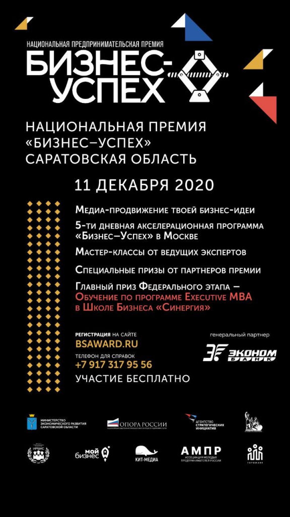 В рамках национального проекта «Малое и среднее предпринимательство и поддержка предпринимательской инициативы», реализуется всероссийский конкурс среди представителей МСП. Заказчиком регионального этапа «Бизнес-успеха» является Министерство экономического развития Саратовской области.«Бизнес-успех» в Саратовской области будет проходить в несколько этапов: