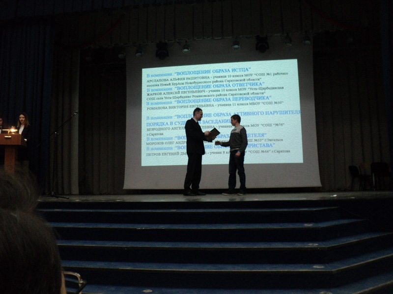 Памятные призы и грамоты были вручены учащимся школ в различных номинациях: лучшее эссе, воплощение образа судьи в игровых процессах по уголовным делам, воплощение образа судьи в игровых процессах по гражданским делам, воплощение образов защитника (адвоката), подсудимого, свидетеля, потерпевшего, государственного обвинителя (прокурора) и других.