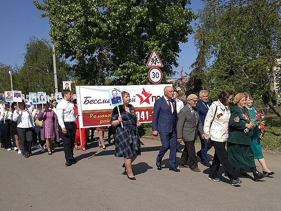 Романовцы прошли от памятника воинам, погибшим в годы Великой Отечественной войны 1941-1945 годов, до центральной площади с портретами своих родственников-участников Великой Отечественной войны, бойцов Сопротивления, тружеников тыла, узников концлагерей, блокадников, детей войны.