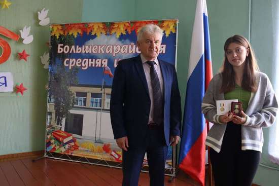 На основании распоряжения Губернатора Саратовской области за высокий уровень знаний глава Романовского района А.И. Щербаков вручил Почетный знак Губернатора Цыплаковой Юлии, выпускнице 11 класса филиала МОУ Романовская СОШ им. И.В. Серещенко в селе Большой Карай. Поздравил Юлию с этим значимым событием.