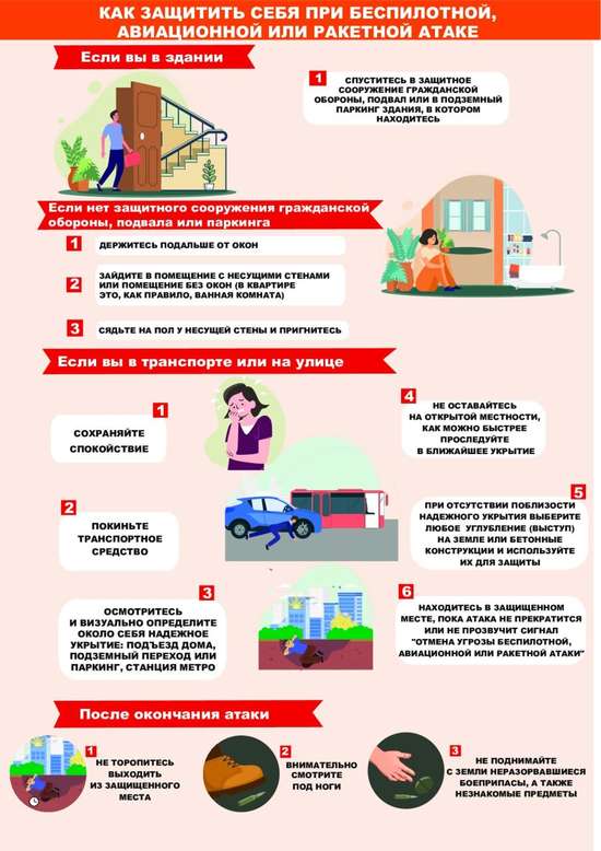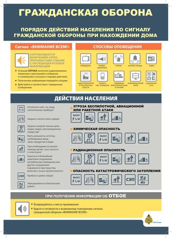 Памятка по действиям при угрозе: беспилотная, авиационная или ракетная атака, катастрофическое затопление, радиационное (химическое) заражение.Берегите себя и близких, соблюдайте порядок и спокойствие!
