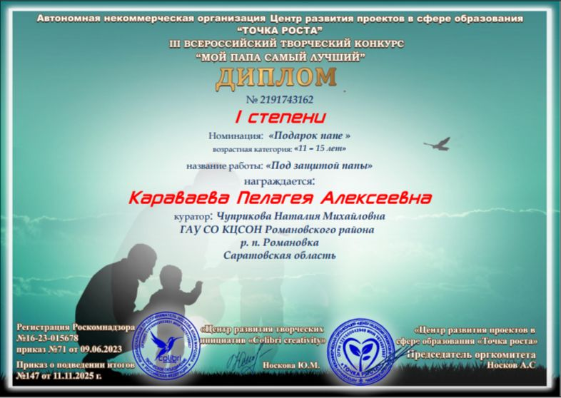 11-летняя Караваева Пелагея – ученица МОУ Романовская СОШ им. И.В. Серещенко – приняла участие в III Всероссийском конкурсе «Мой папа самый лучший!» в номинации «Подарок папе» и награждается дипломом I степени за рисунок «Под защитой папы», написанный красками.