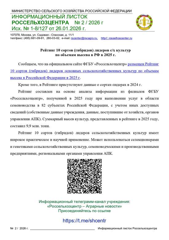 Рейтинг 10 сортов (гибридов) лидеров с/х культур по объемам высева в РФ в 2025 г.
