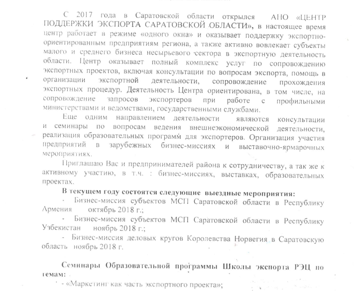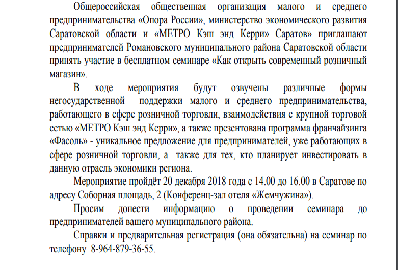 12 февраля 2019 года в 12 часов в актовом зале администрации муниципального района ( ул. Народная,10) состоится встреча представителей бизнеса района с представителями областной инфраструктуры поддержки МСП и представителями министерства экономического развития области с целью информирования субъектов малого и среднего предпринимательства о мерах государственной поддержки , реализуемых на территории Саратовской области, а также в соответствии с пунктом 4 перечня поручений , данных Губернатором Саратовской области В.В. Радаевым в ходе посещения Романовского района.