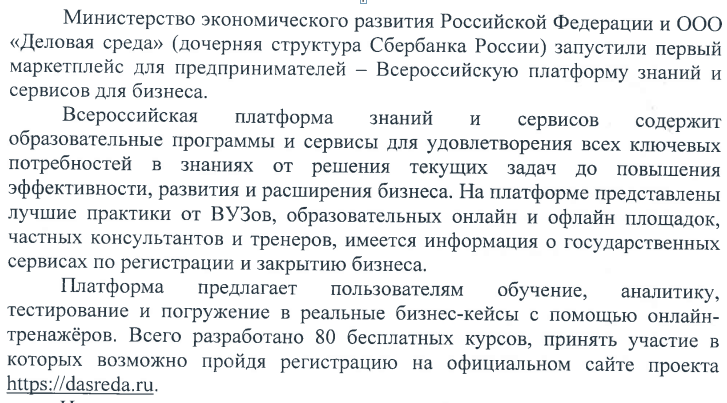 Для максимально возможного охвата потенциальных участников прошу Вас оказать содействие в информировании активных предпринимателей Вашего района о возможности бесплатного участия в программе, разместить пресс-релиз программы на сайте администрации муниципального района, в официальных аккаунтах администрации в социальных сетях, в местных средствах массовой информации.