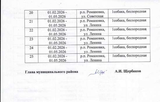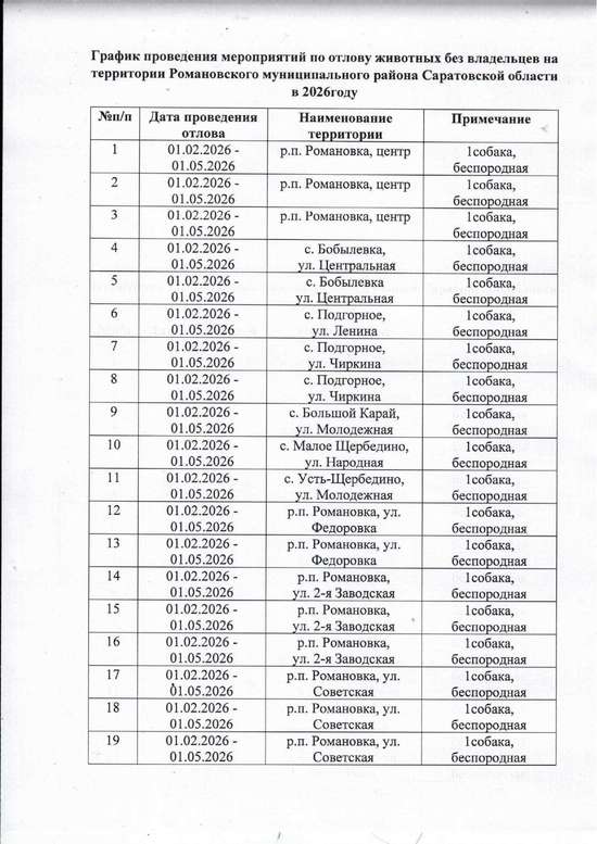 График проведения мероприятий по отлову животных без владельцев на территории Романовского МР в 2026 году.