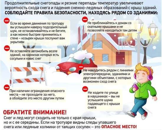 Продолжительные снегопады и резкие перепады температур увеличивают вероятность схода снега и падения снежно-ледяных образований с крыш зданий.