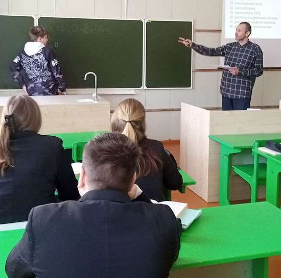 - Урок на тему: «Получение и химические свойства оснований» в 8 классе показал учитель химии МОУ Романовская СОШ им. И.В. Серещенко Тарасов Сергей Николаевич. Восьмиклассники работали с химическими уравнениями, таблицей группы веществ, самые активные ученики зарабатывали жетоны.