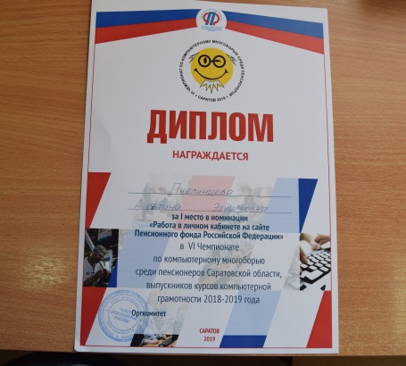 Алефтина Пчелинцева награждена дипломом за I место в номинации «Работа в личном кабинете на сайте Пенсионного фонда Российской Федерации» и памятным подарком.