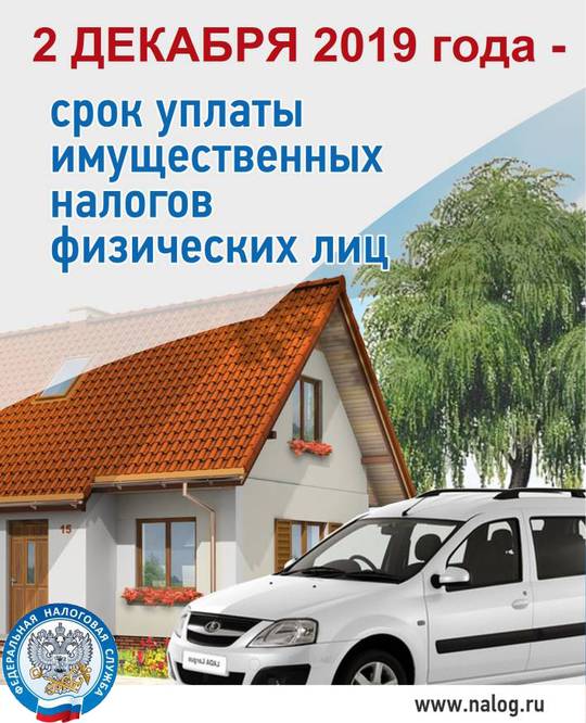 Налоги на имущество, земельный и транспортный налог в соответствии с действующим законодательством уплачиваются не позднее 1 декабря года, следующего за истекшим периодом (годом). Учитывая, что 01.12.2019 г. приходится на воскресенье, срок уплаты имущественных налогов в 2019 году – не позднее 02.12.2019г.