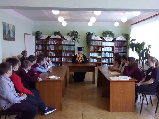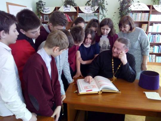 На встречу с юными читателями пришел Благочинный Романовского округа иерей Павел Денисов. Яркое впечатление на школьников произвел его рассказ о первой книге «Апостол» и предоставленная возможность самим прочесть строки из нее. Беседуя с детьми, отец Павел говорил о книге как о главном источнике культуры, мудром учителе жизни, хранителе исторической памяти, а также о значении книги в жизни человека и пользе чтения.