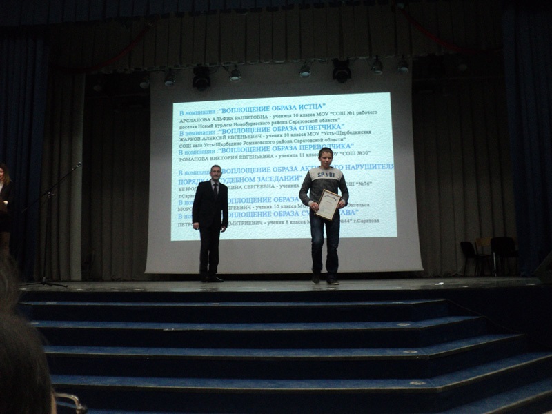 Памятные призы и грамоты были вручены учащимся школ в различных номинациях: лучшее эссе, воплощение образа судьи в игровых процессах по уголовным делам, воплощение образа судьи в игровых процессах по гражданским делам, воплощение образов защитника (адвоката), подсудимого, свидетеля, потерпевшего, государственного обвинителя (прокурора) и других.