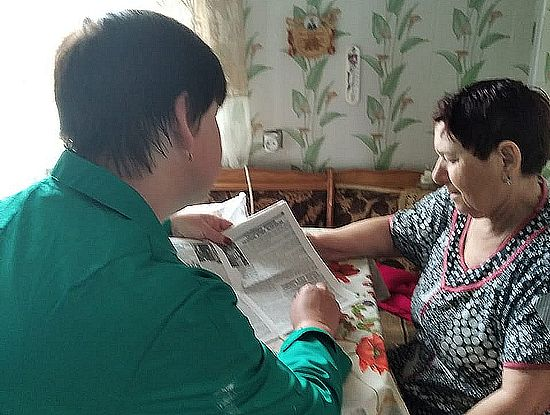 На фото: социальный работник Центра Ирина Тарасова вместе с получательницей социальных услуг Федотовой Лидией Михайловной читают свежую районную газету «Восход».