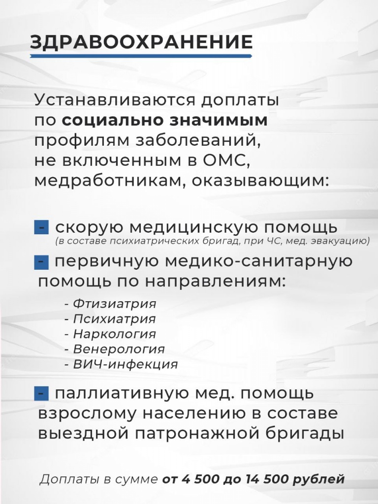 Разрабатываем новые меры поддержки для наших бюджетников. С октября этого года увеличим зарплаты работников региональных учреждений социальной сферы, спорта и культуры на 9,6%. Наряду с этим у ряда работников здравоохранения и образования появятся доплаты. Повышения затронут более 50 тысяч человек.