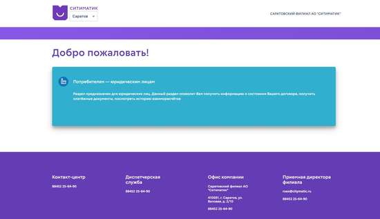 Личный кабинет находится на сайте 64.citymatic.ru в разделе «Юрлицам⬈». Для работы в нем необходимо пройти несложную регистрацию или авторизацию.