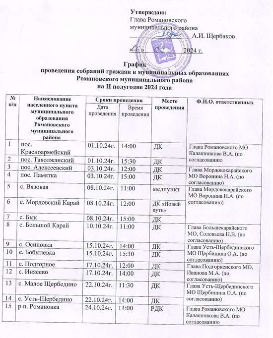 График проведения собраний граждан в муниципальных образованиях Романовского муниципального района на II полугодие 2024 года.