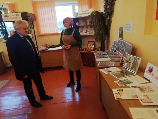 Сегодня глава Романовского района А.И. Щербаков посетил центральную библиотеку им. И. И. Фешина в р.п. Романовка, где сотрудники библиотечной системы открыли выставку «Злодеяния киевского неонацистского режима в Курской области».