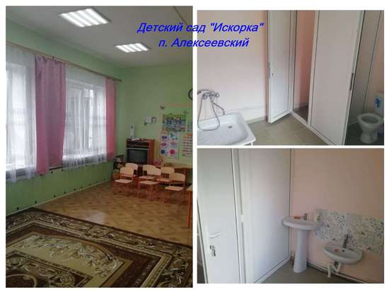 - в детском саду «Искорка» п. Алексеевский. Полностью перекрыта крыша здания, установлены новые оконные и дверные блоки, настелены полы в коридоре, проведена канализация, выполнен внутренний ремонт помещения, установлены новые умывальники и унитазы.