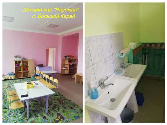- в детском саду «Надежда» с. Большой Карай. Были выравнены, оштукатурены и покрашены стены, заменены светильники, оконные и дверные блоки, установлены новые умывальники и унитазы, проведен ремонт в пищеблоке.