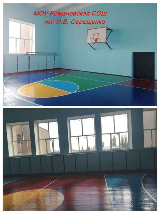 - спортивного зала в МОУ Романовская СОШ им. И.В. Серещенко - установлены дверные и оконные блоки, светильники, выравнены и покрашены стены, потолок, сделана декоративная отделка поверхности пола.