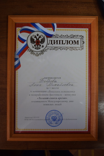 «Талант сквозь время» 27 сентября в г. Балашове состоялся межрайонный фестиваль-конкурс «Талант сквозь время», посвященный Международному дню пожилого человека. Фестиваль направлен на выявление и поддержку творческих одаренных людей старшего поколения. От комплексного центра социального обслуживания населения Романовского района в фестивале приняла участие «серебряный волонтер» Анна Михайловна Боброва. Пройдя все отборочные туры, наша конкурсантка вышла в финал. Покорив жюри и зрителей песней «Как много лет во мне любовь спала», заняла первое место в номинации «Вокальное исполнение». Награждена дипломом и памятным подарком. Фестиваль стал хорошей возможностью показать свои таланты.