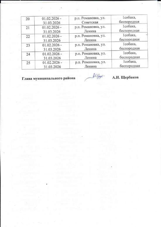 График проведения мероприятий по отлову животных без владельцев на территории Романовского МР в 2026 году.