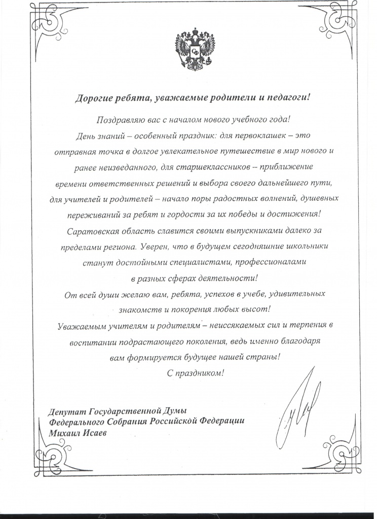 Поздравление депутата Государственной Думы РФ М.А.Исаева с Днем знаний