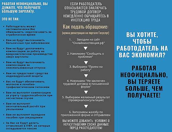 Чтобы не подвергать себя опасности и не способствовать развитию неформальной занятости, необходимо пресекать предложения работодателя не заключать трудовой договор. Напоминаем, что для этого вы можете обратиться в Государственную инспекцию труда в Саратовской области.